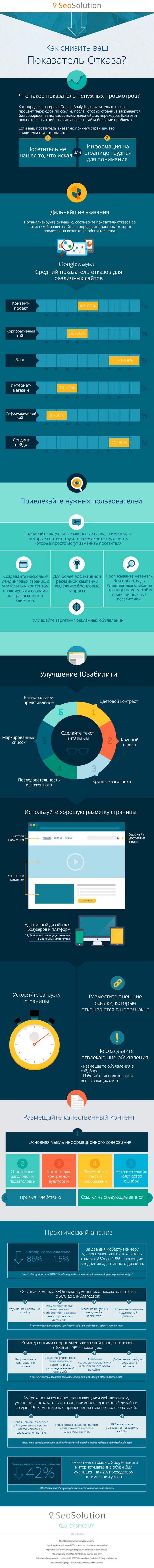 Вы наверняка слышали о таком термине, как показатель или процент отказа, но, возможно, не задумывались о том, для чего он нужен. Те, кто пользуются Google Analytics или другими подобными инструментами, знают, что показатель отказов – это процент переходов по ссылке на сайт, после которых страница закрывается без совершения пользователем дальнейших переходов. Если этот показатель высокий, значит у вашего сайта большие проблемы. Кроме непосредственного негативного влияния на конверсию вы имеете негативное влияние на ранжирование сайта поисковыми системами. В данной инфографике вы найдете всю информацию относительно того, что влияет на процент отказа, и как его снизить максимально оперативно.