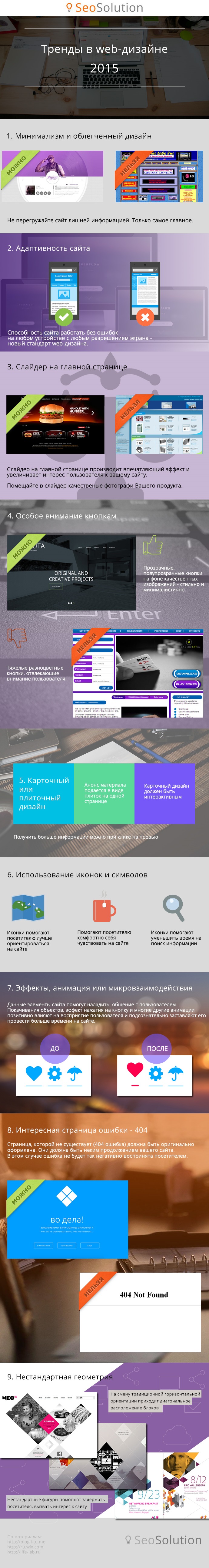 Web-дизайн как раз одна из тех сфер, за которой нужен глаз да глаз. Одни элементы дизайна стремительно совершенствуются, а другие исчезают из виду вовсе. Сегодня миром web-дизайна правит минимализм и адаптивность сайта. Слайдер на главной странице в несколько раз увеличивает интерес пользователя к предлагаемой странице. Особое внимание теперь уделяется прозрачным или полупрозрачным кнопкам, которые располагаются на фоне качественных изображений. Использование кнопок и иконок помогают пользователю уверено ориентироваться на сайте, а эффекты и анимация позитивно влияют на восприятие пользователя. Новый тренд 2015 года - нестандартная геометрия: помогает задержать посетителя и вызвать интерес к сайту. А что выберете вы?